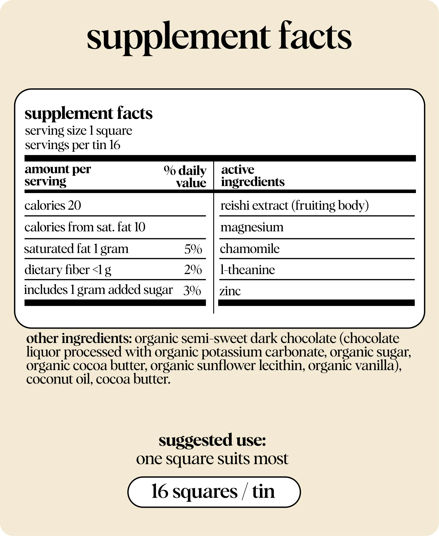 Fairly traded organic dark chocolate, organic Reishi from 100% fruiting body mushrooms, chamomile, L-theanine, magnesium, zinc.